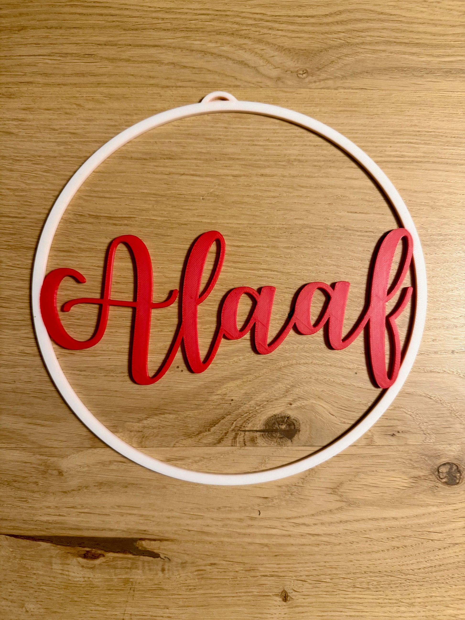 Diese Datei ist eine digitale 3D Druckdatei für einen Fensteranhänger mit dem Schriftzug „Alaaf“ im ovalen Rahmen. Das Design ist für den mehrfarbigen Druck ausgelegt und verfügt über eine integrierte Aufhängungsöse.
