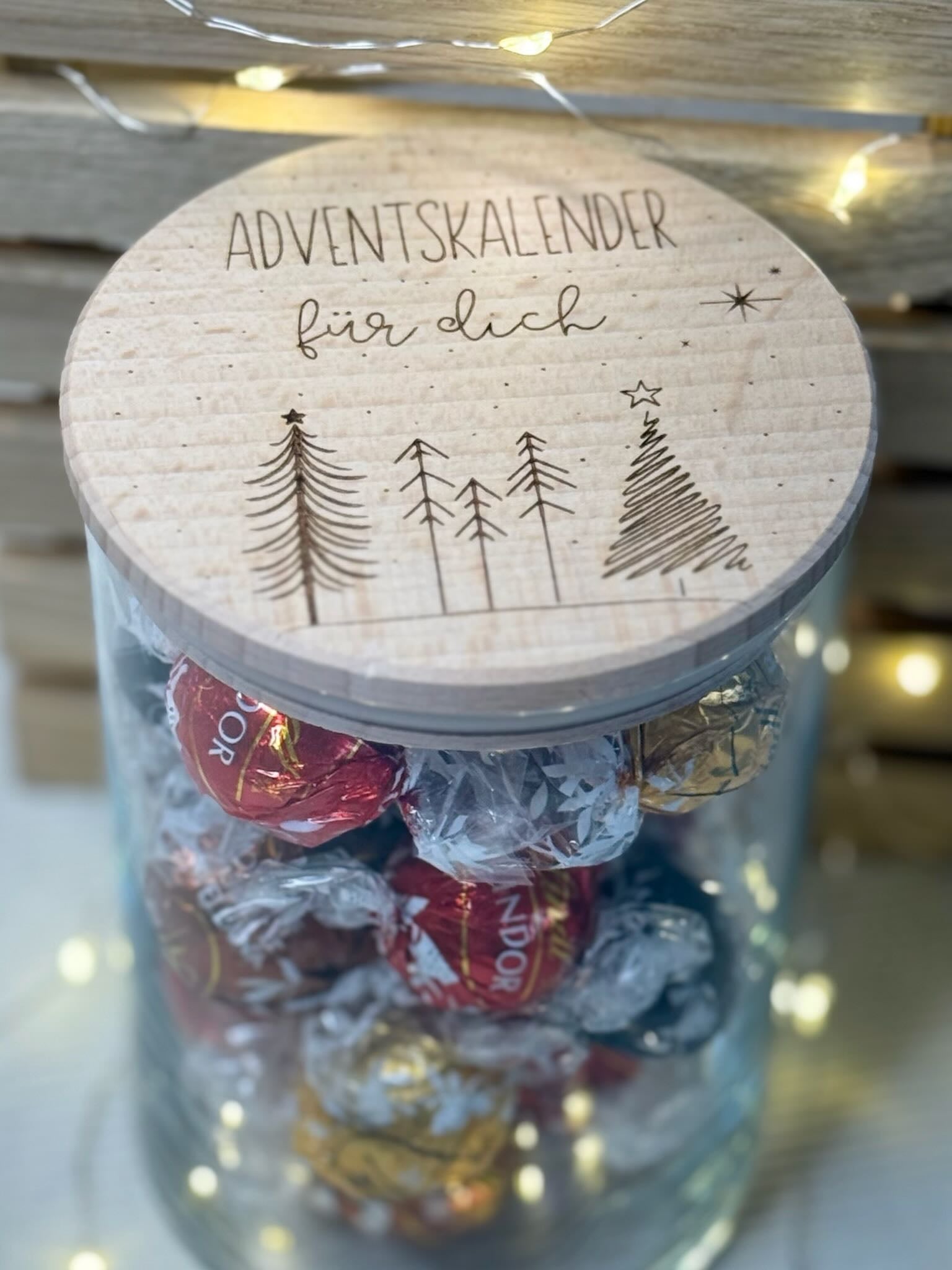 Du willst dieses Jahr keinen 08/15-Adventskalender verschenken? Dann schnapp dir unser liebevoll graviertes Vorratsglas mit Holzdeckel – und mach ihn einfach selbst zu etwas ganz Besonderem.