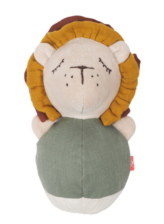 Bounce Löwe von Kikadu: Ein wahres Stehauf-"Löwchen". Er mag angestupst werden, pendelt dann fröhlich hin und her und macht dabei zarte Glöckengeräusche. Beim Anstupsen des kugeligen Löwen raschelt und knistert es aber erstmal - eine weitere Spielüberraschung für das Baby während der Tummy-Time.