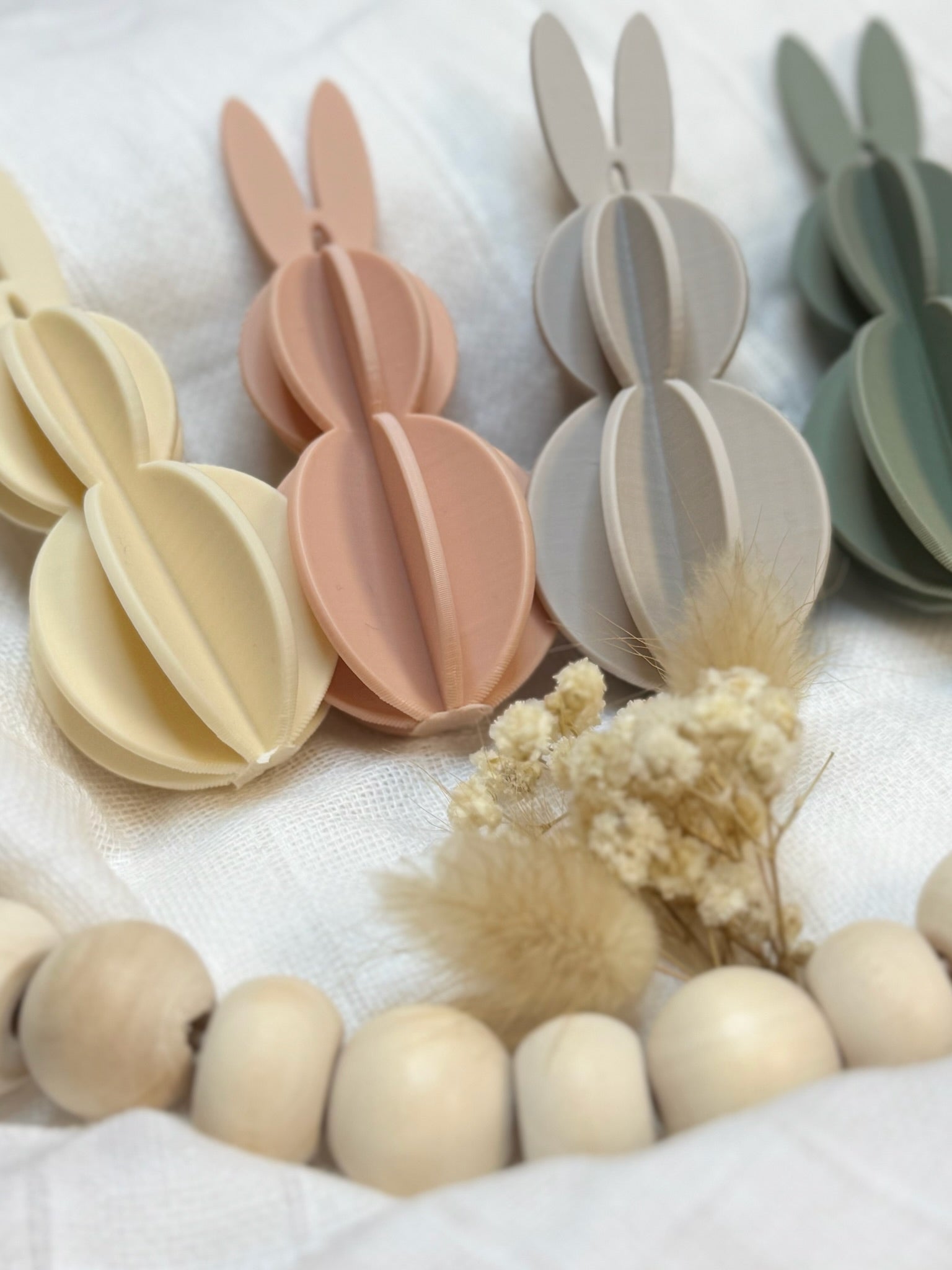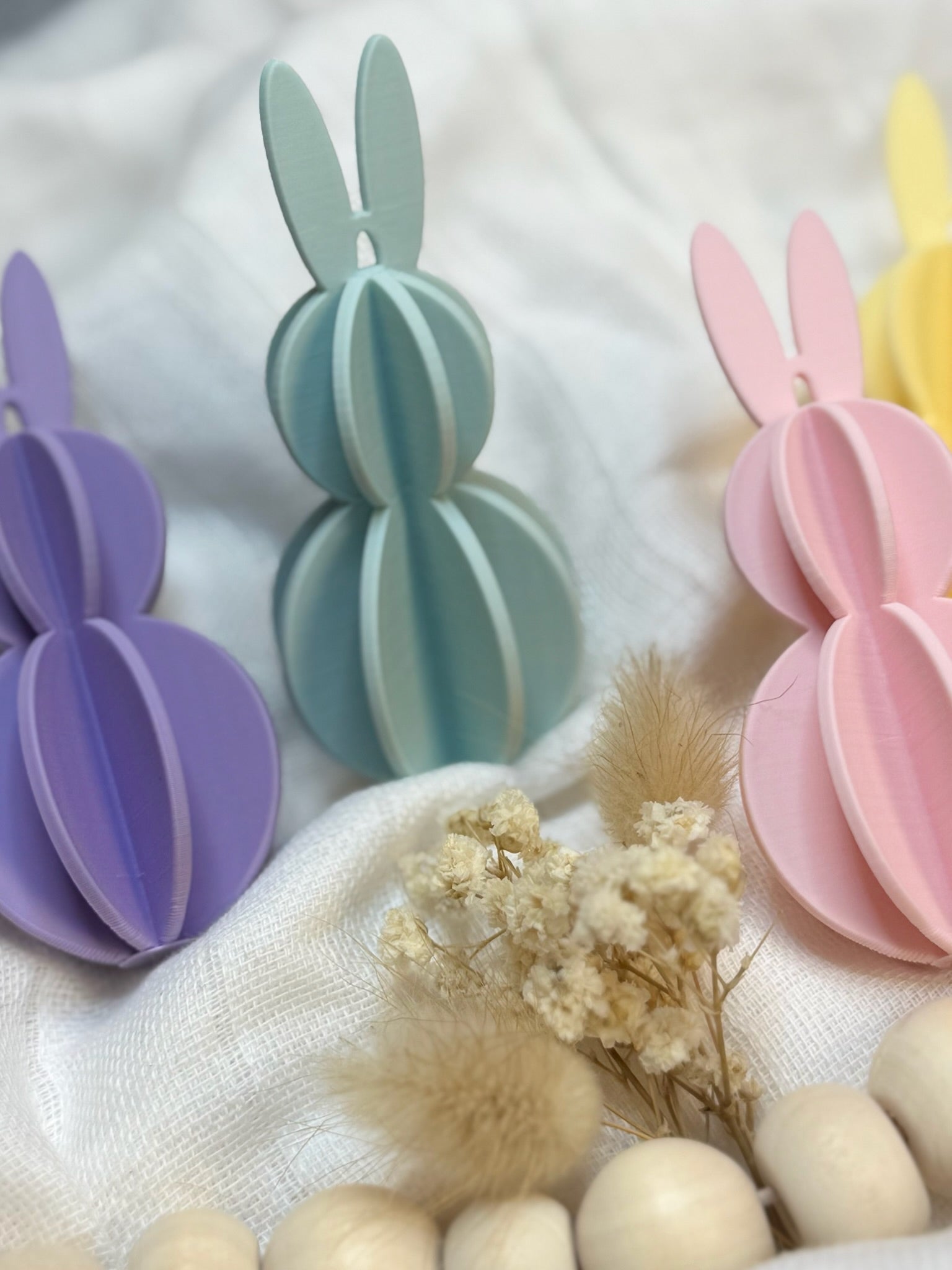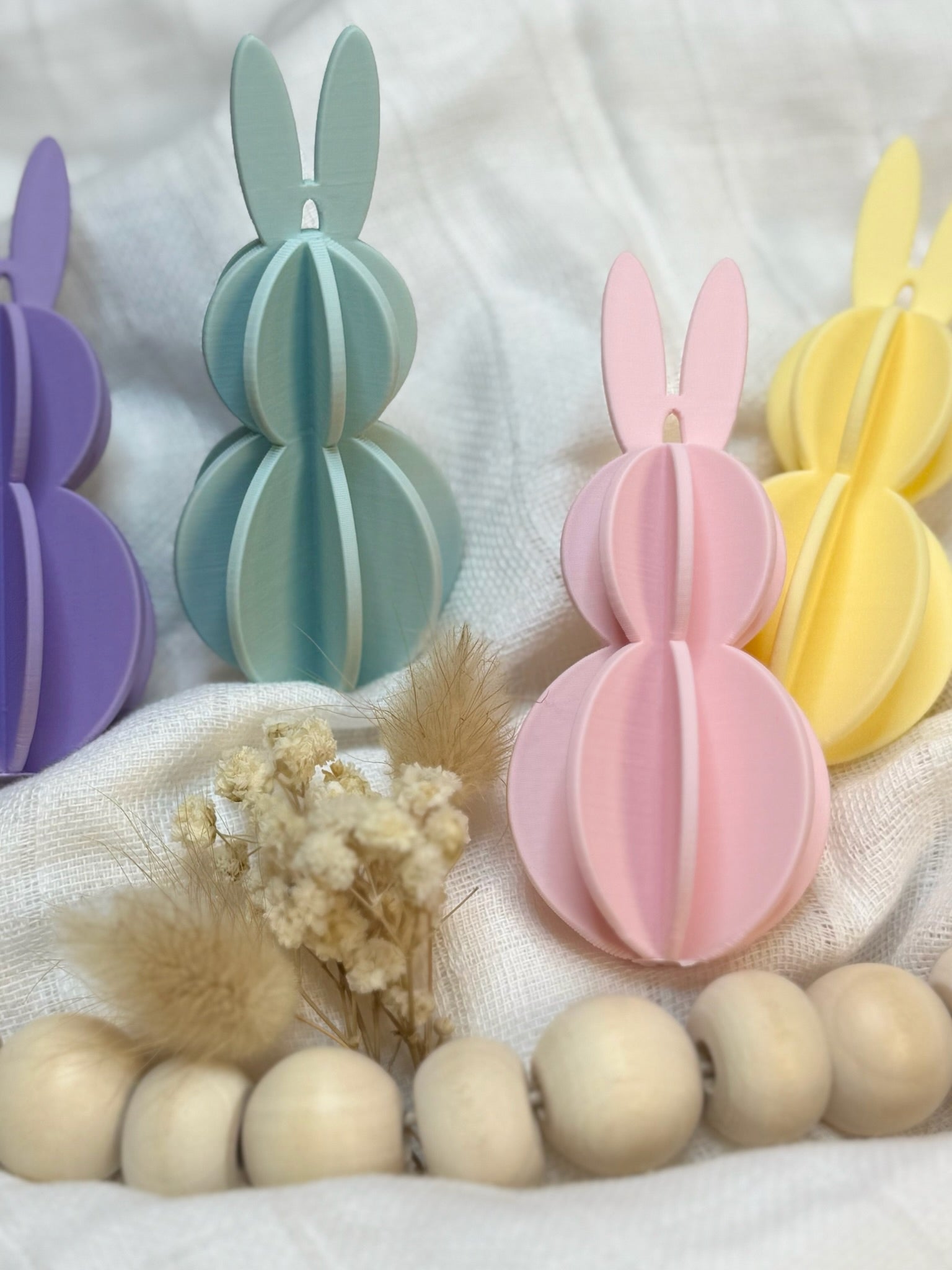 Dieses 4er Set moderner Osterhasen Anhänger verbindet minimalistisches Design mit einer markanten Wabenstruktur. Die Hasen werden im 3D Druckverfahren gefertigt und sind perfekt geeignet als moderne Anhänger für Osterzweige, Fenster, Ostersträuße oder als stilvolle Frühlingsdeko.