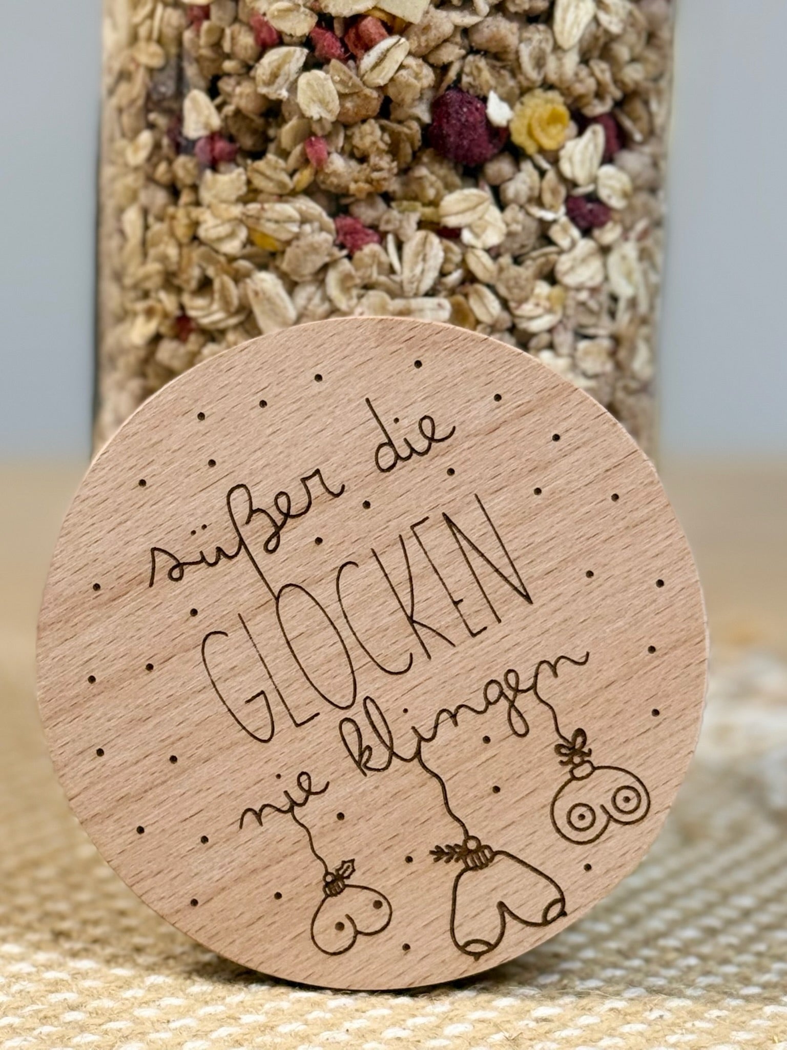 Unser Vorratsglas „Süßer die Glocken nie klingen“ ist der perfekte Mix aus Stil, Witz und Laserliebe – ideal für Plätzchen, Müsli, Nüsse oder alles, was du (nicht ganz so brav) aufbewahren willst. 🎅